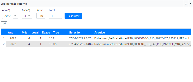 Para consultar o log de geração de arquivos RL e Lis vá em Fechamento > Log Geração Retorno, informe o ano, mês, razão e local.