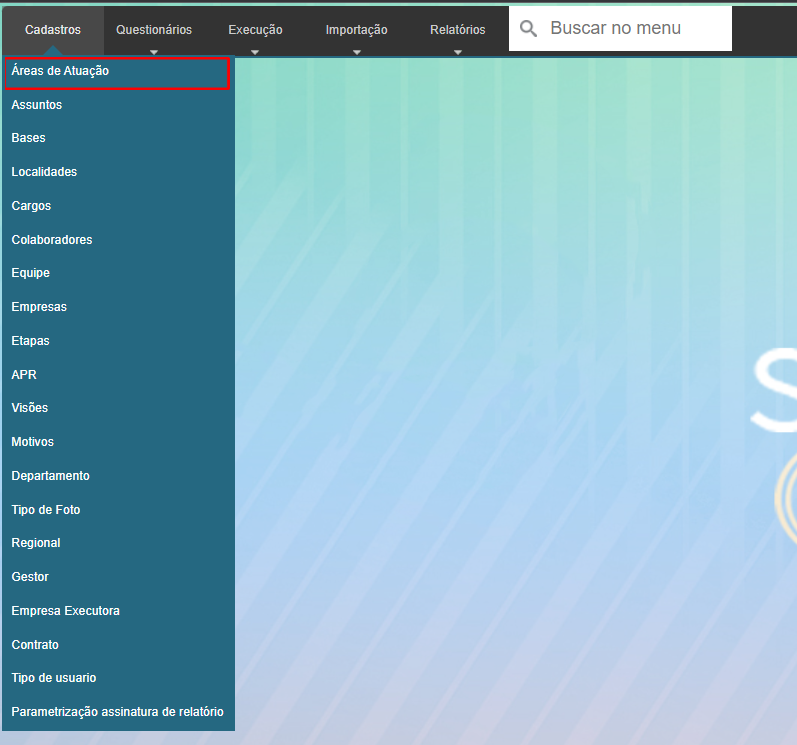Neste menu pode ser cadastrado ou alterado os ÁREA DE ATUAÇÃO , para acessar bastar ir em Cadastro > ÁREA DE ATUAÇÃO: