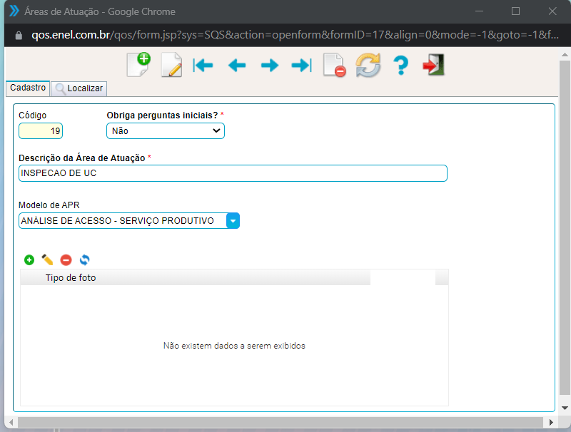 Para preencher basta no primeiro campo escolher se essa área de atuação irá exigir as perguntas iniciais, em seguida definir uma descrição, caso precise da APR, selecione no campo Modelo de APR. Também caso precise também é possivel incluir tipo de fot no grid abaixo, não sendo obrigatório estes dois ultimos itens.
