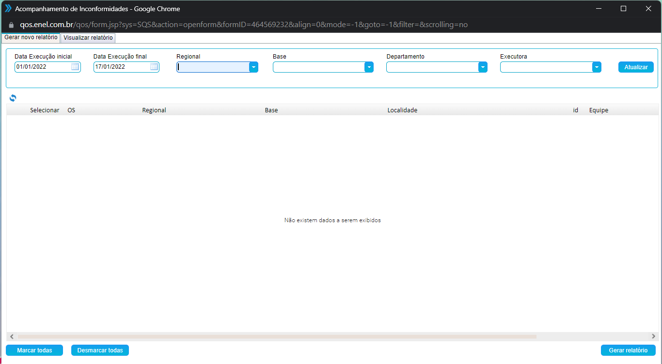 Para gerar um novo relatório utilizes os filtros disponíveis na aba gerar relatório e e cliquem em atualizar, após listar as incoformidades, selecione e gere o relatório no botão no canto inferior direito