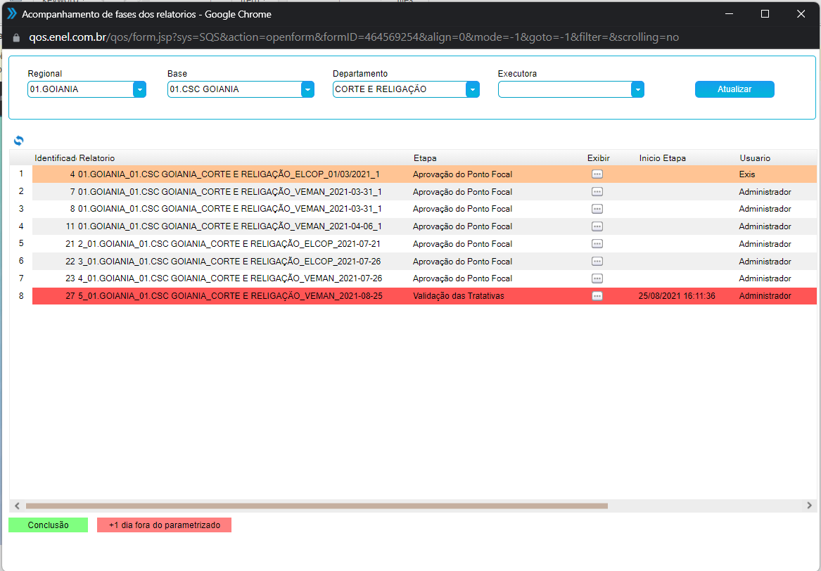 Para realizar o Acompanhamto de fases dos relatórios, utilize os filtros disponíveis e clique em atualizar, para exibir é necessário ter permissão para acessar, essa permissão e concedida em tipo de usuário: