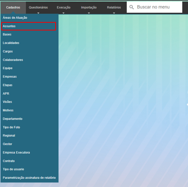 ` Neste menu pode ser cadastrado ou alterado os Assuntos , para acessar bastar ir em Cadastro > Assuntos: