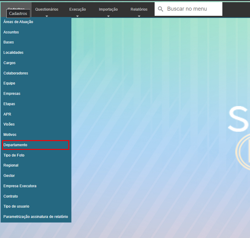 Neste menu pode ser cadastrado ou alterado os Departamento, para acessar bastar ir em Cadastro > Departamento: