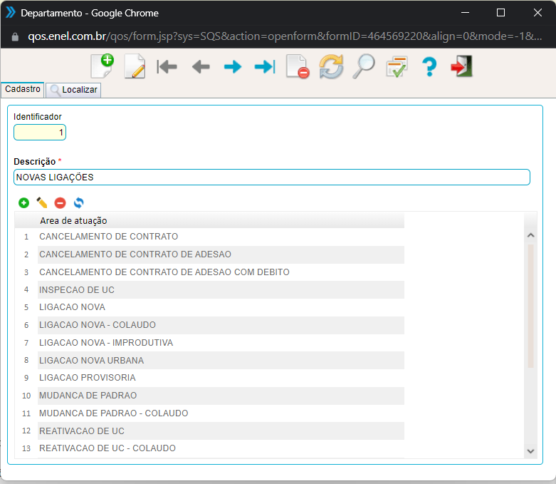 Nesta sessão será cadastrados os departamentos e quais áreas de atuação terão acesso, basta preencher a descrição com o nome do departamento, em seguida utilize a barra de ferramentas abaixo de descrição para incuir, alterar ou excluir as respectivas áreas de atuações.