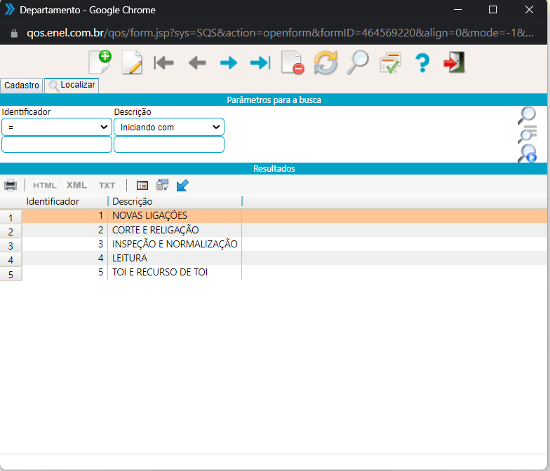 Caso deseje localizar um registro mais rapidamente, utilize a aba localizar para pra encontrar registros já cadastrados, podendo ser filtrados utilizando os filtro código,ou descrição: