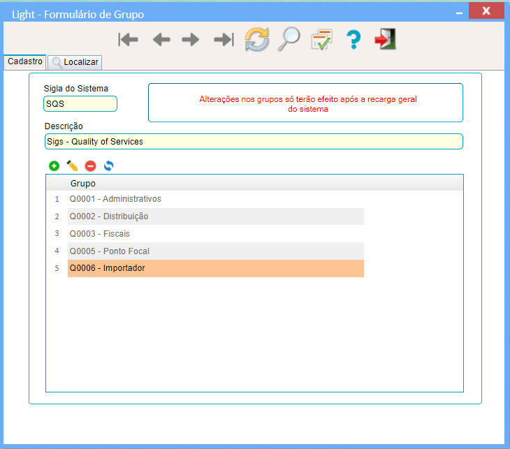 Para que as alterações feitas nos grupos tenha efeitos e preciso recarregar o sistema através do botão recarregar localizado na laterial esquerda