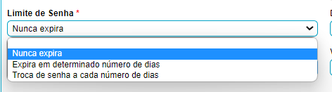 No campo login será utilizado para fazer login no sistema web, senha preencha com senha forte, deve conter letra, numero e simbolo. O campo Administrador Geral selecione sim caso o usuário seja ou não caso não seja um administrador., em seguida coloque o nome, email, no campo Limite de senha defina se a senha deste usuário irá expirar e um prazo "X" ou a cada numero de dias "X" :