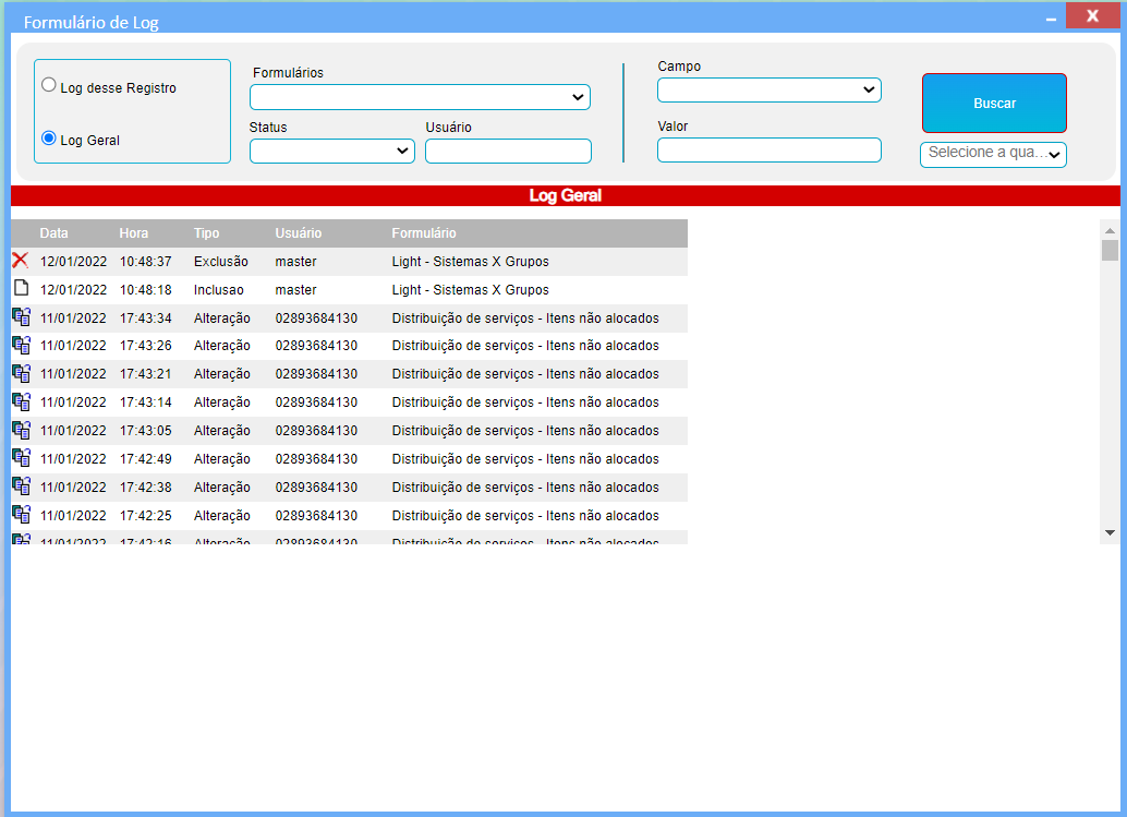 Nesta tela sera exbido um Formulário de log com todas alterações feitas no sistema, como por exemplo inclusão ou exclusão de algum registro, dentre outras alterações.