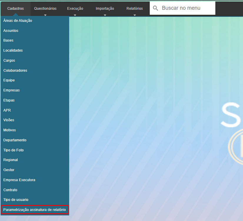 Neste menu pode ser cadastrado ou alterado os Parametrização assinatura de relatório, para acessar bastar ir em Cadastro > Parametrização assinatura de relatório: