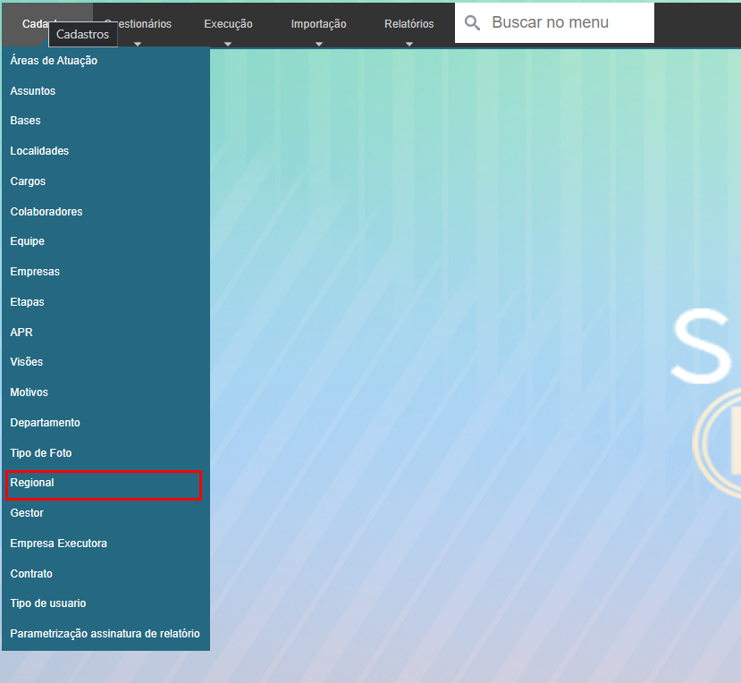 Neste menu pode ser cadastrado ou alterado os Regional, para acessar bastar ir em Cadastro > Regional: