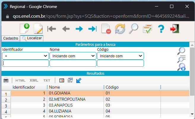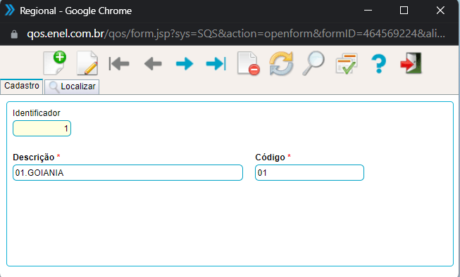 Caso deseje localizar um registro mais rapidamente, utilize a aba localizar para pra encontrar registros já cadastrados, podendo ser filtrados utilizando os filtro código,identificador ou nome: