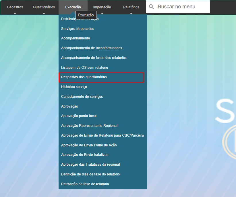 Para acessar as Resposta dos Questionários basata acessa o menu Execução> Resposta dos Questionários.