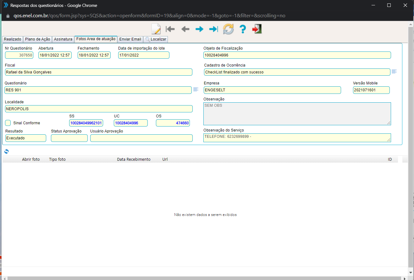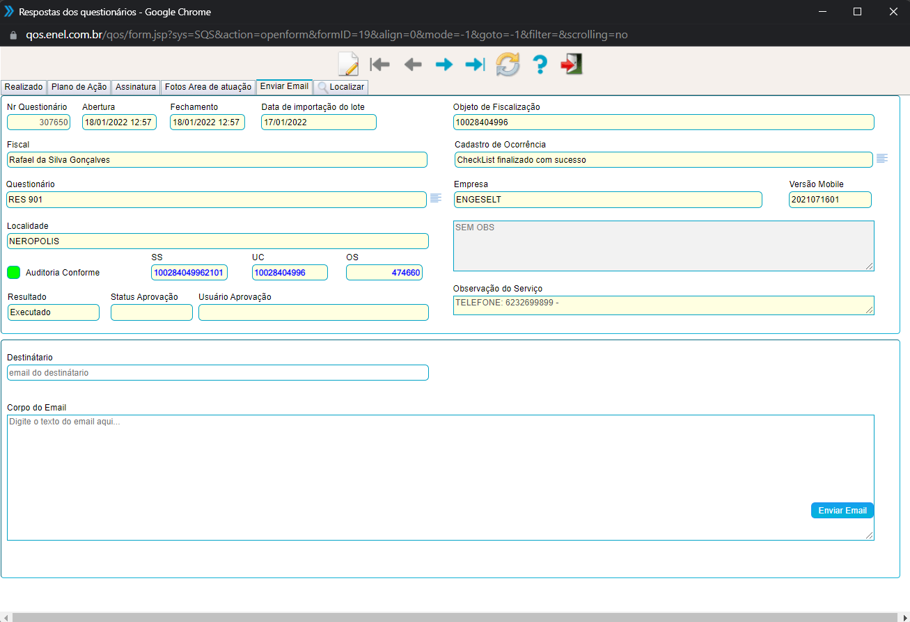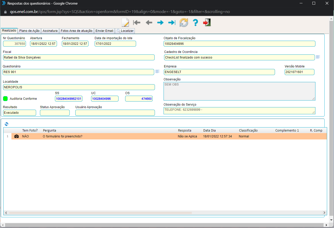 Você terá acesso a todos questionários respondidos, com infornações como numero do questionário, plano de ação, assiantura, foto da área de atuação, enviar email: