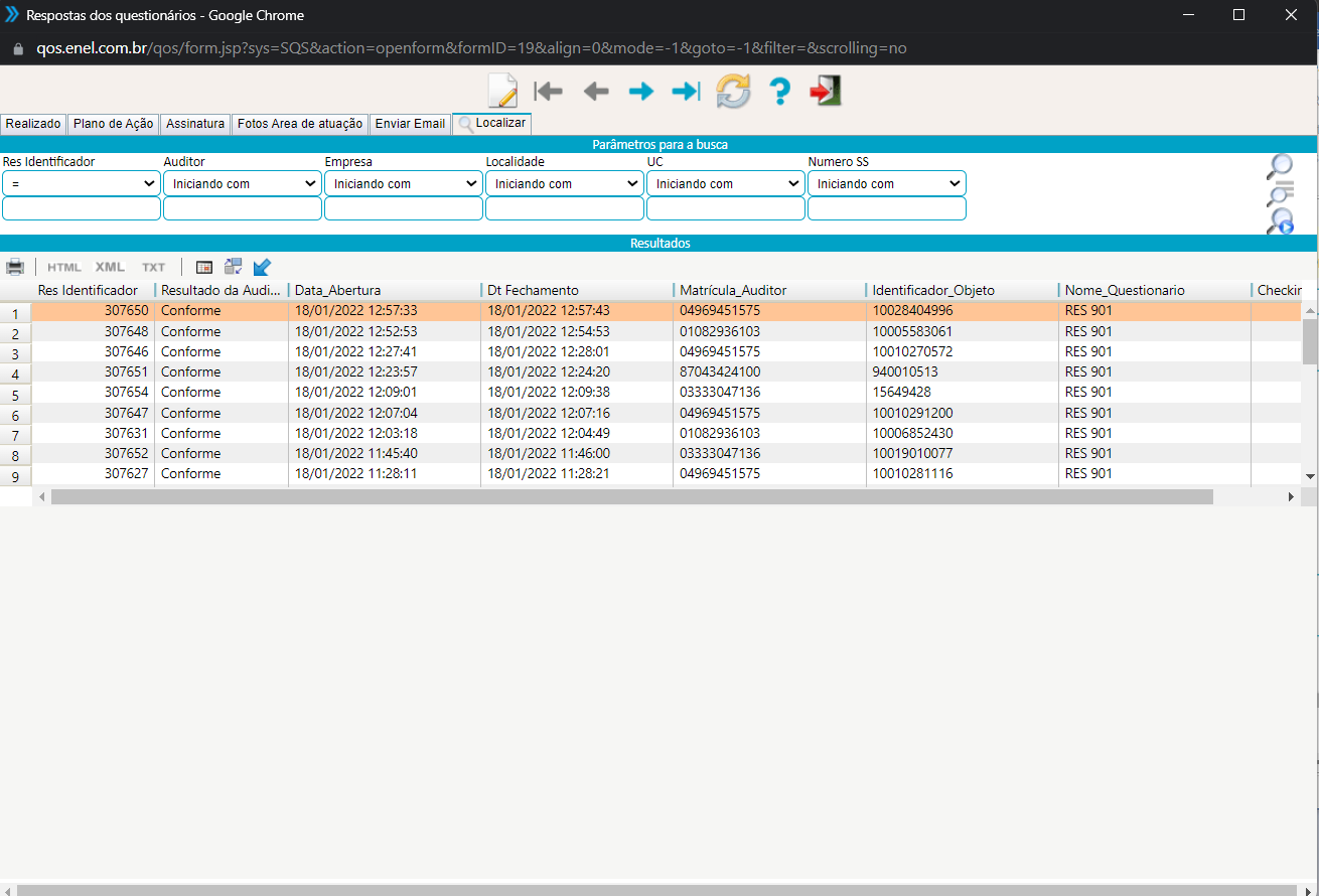Para localizar um questionário utilize os filtros disponíveis para buscar, ao encontrar de um duplo clque sobre o mesmo será levado para aba realizado: